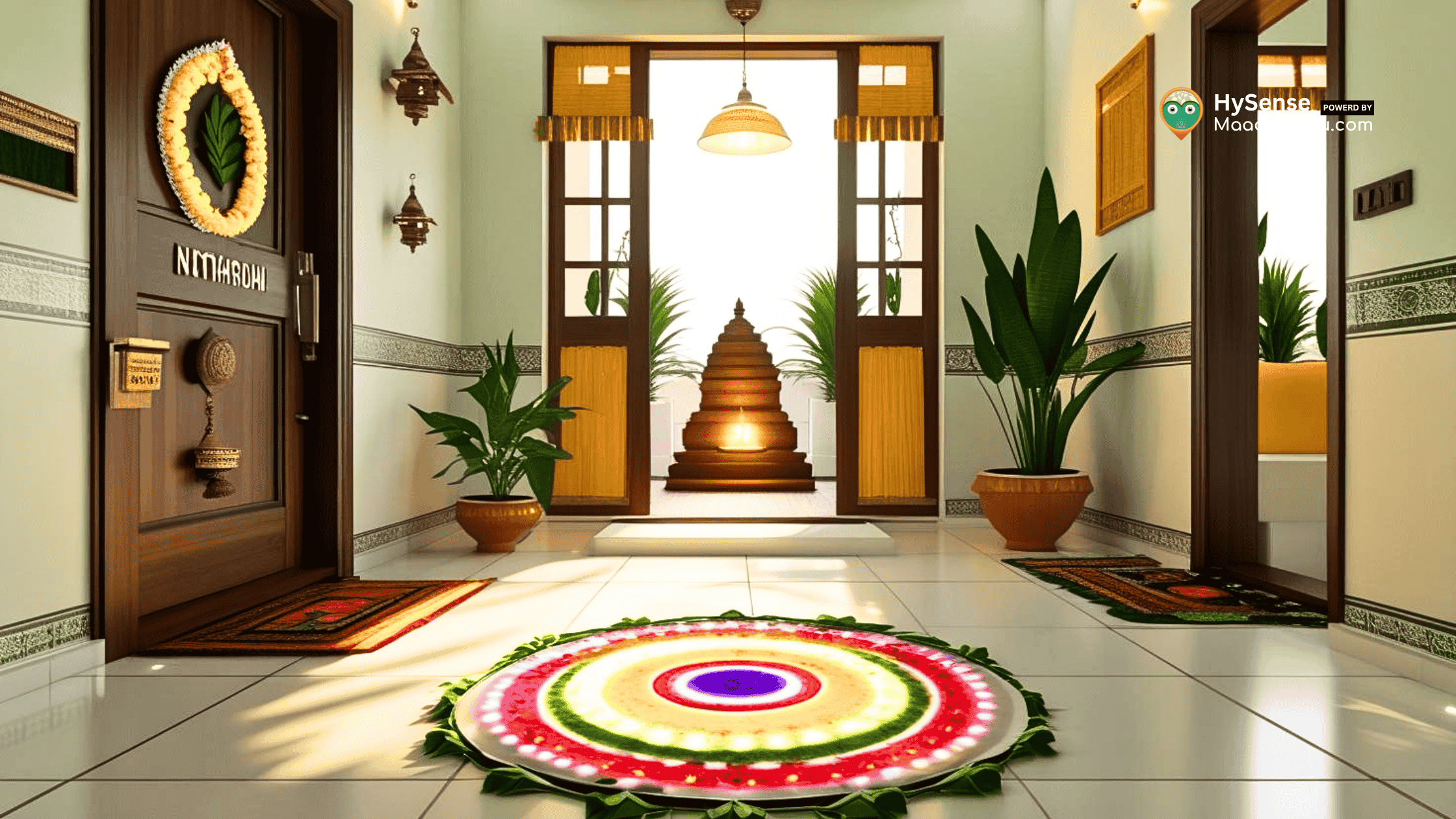 Pro Tip: Hang a nameplate and place a toran (decorative band) with mango leaves or marigold to enhance welcoming vibes.